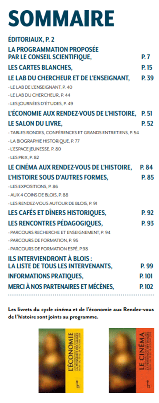 Le programme de ces 21èmes rendez-vous qui se tiendront à Blois du 10 au 14 octobre 2018 est – c’est peu dire – abondant et les thèmes multiples : à voir dans ce fichier PDF :